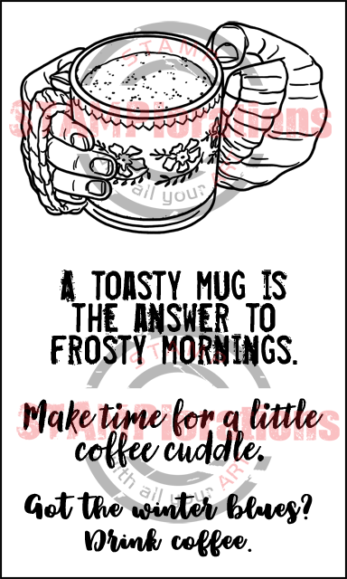 ONE (1) package of TOASTY MUG clear stamp set in the Shery Russ Designs line. There are 4 pieces of clear stamps in the package. The image is approx. 2.65" wide and 1.8" tall.