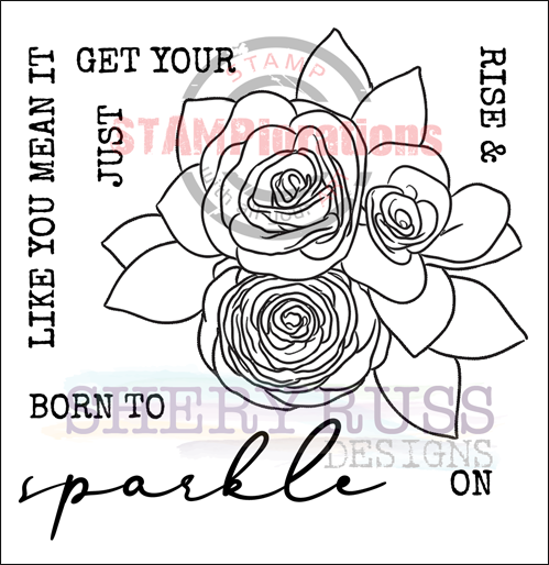 ONE (1) package of BLOOMFULLY: SPARKLE clear stamp set in the Shery Russ Designs line. There are 8 clear stamps in the package: 1 floral image + 7 sentiments