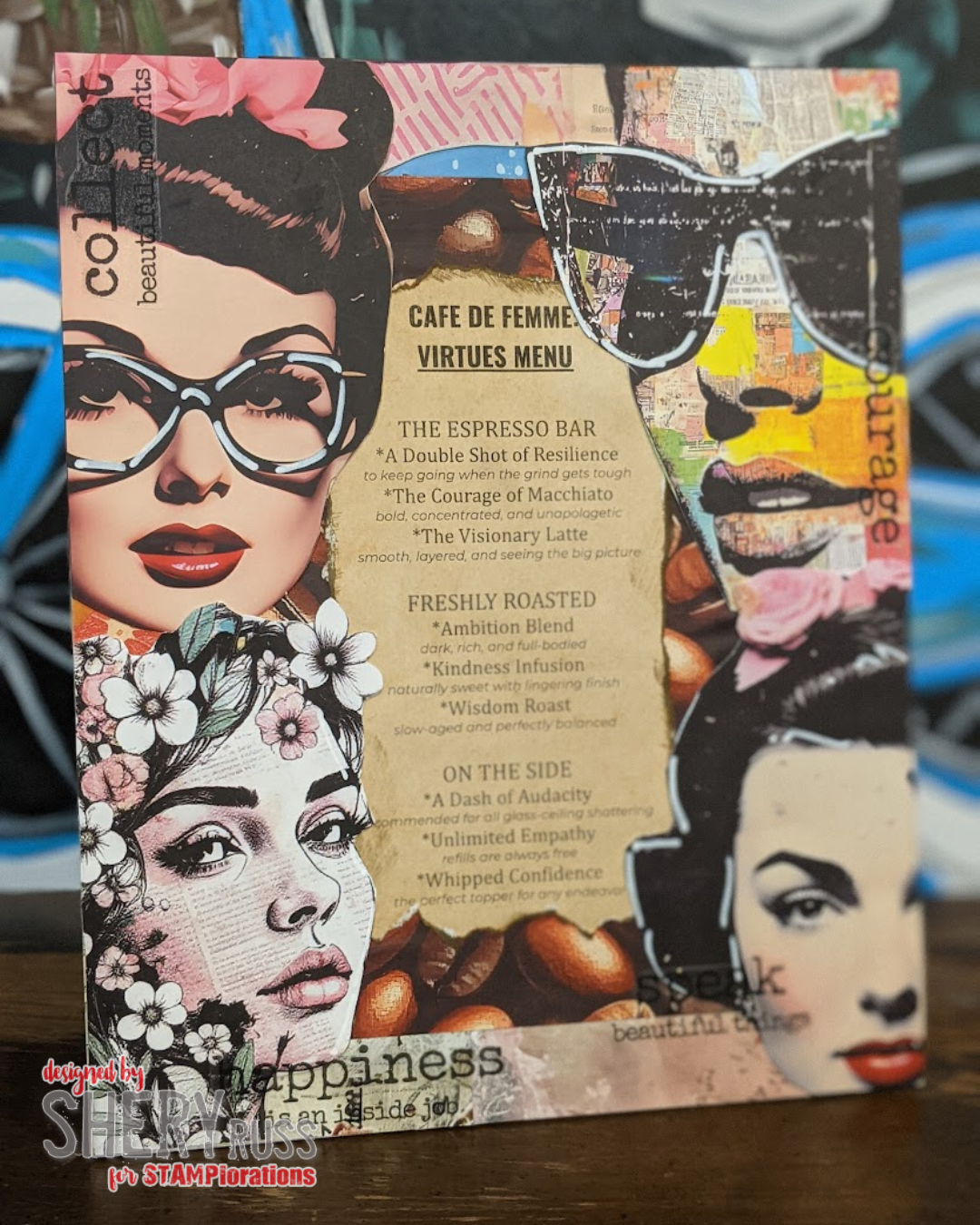 Infuse your home or office with a blend of vintage chic and modern motivation. This original mixed-media collage by STAMPlorations owner Shery Russ, created using STAMPlorations products, reimagines a classic café menu as a soulful guide to living boldly. From "A Double Shot of Resilience" to "Unlimited Empathy," every detail is designed to inspire the visionary in you.